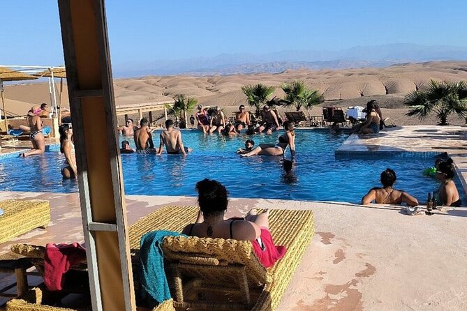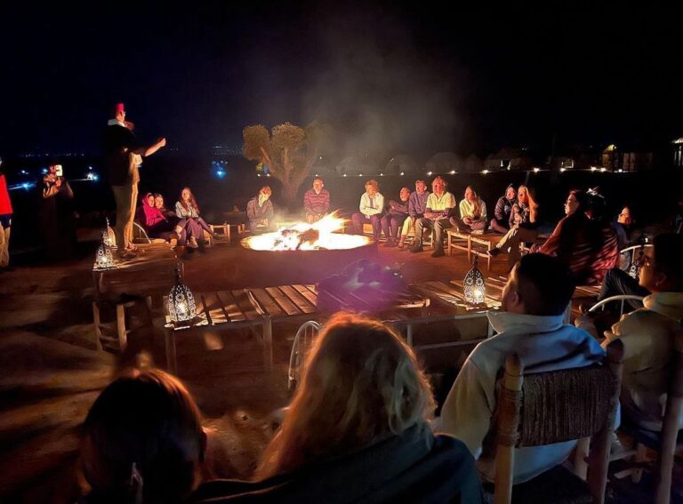 Soirée signature : feu de camp, musique live/danse, ciel étoilé, cuisine marocaine (souvent options végé). Arrivez avant le coucher pour profiter des installations. Placement proche scène pour l’ambiance ; terrasse/haut pour plus de calme. Vérifiez ce qui est inclus (eau/boissons, transferts, gâteau anniversaire).