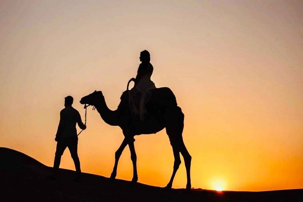 Balade douce et photogénique au rythme du dromadaire. Enfants souvent acceptés selon l’âge/taille. Tenue pratique : chaussures fermées, pantalon léger, coupe-vent selon la saison. Arrivez 60–90 minutes avant l’heure officielle du coucher pour profiter de la lumière dorée.