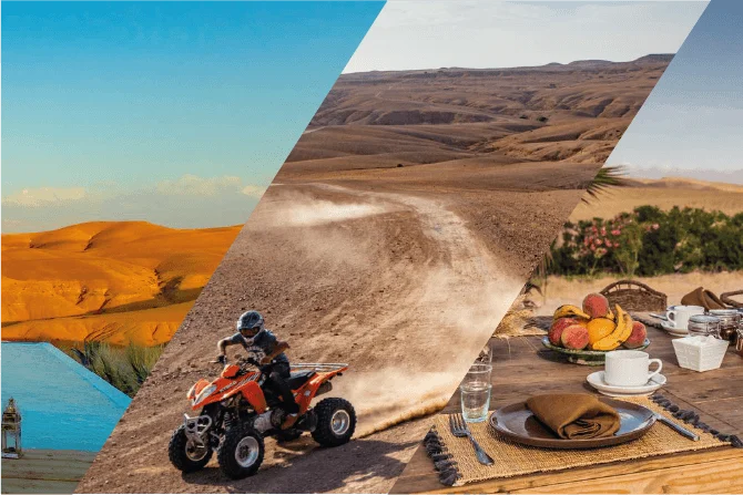 | Combo | Amateurs d’activités | 6–8 h | Moyen à haut | Quad/buggy + camel + dîner | Enchaînement dense |